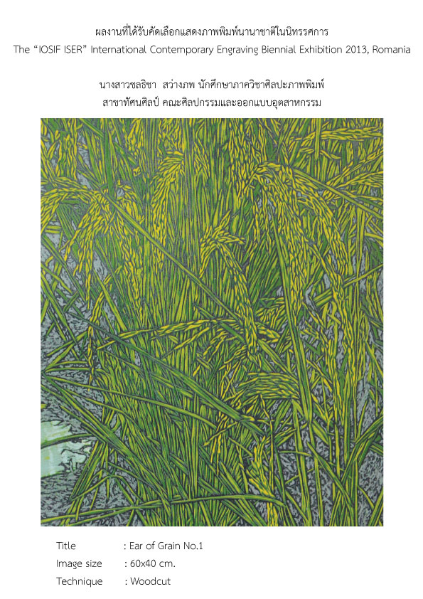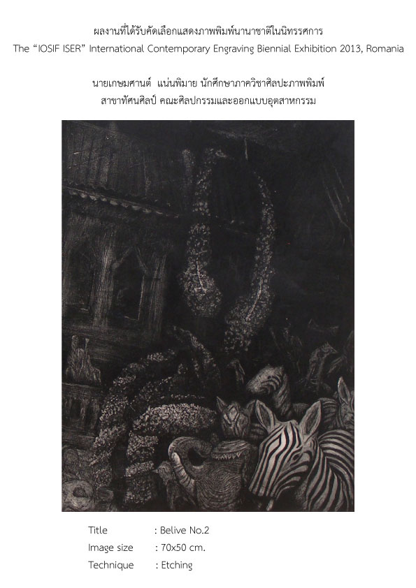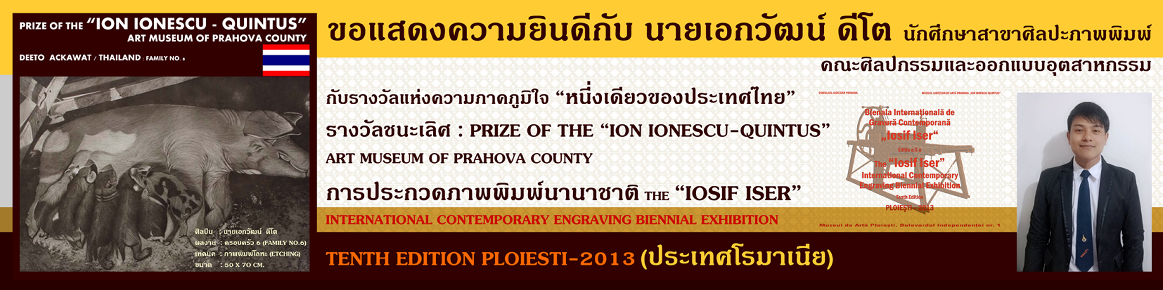 นายเอกวัฒน์ ดีโต นักศึกษาภาควิชาศิลปะภาพพิมพ์ สาขาทัศนศิลป์ คณะศิลปกรรมและออกแบบอุตสาหกรรม ได้รับรางวัล Prize of the “ION IONESCU – QUINTUS” art museum of Phahova County : การแสดงผลงานภาพพิมพ์นานาชาติในนิทรรศการ The “IOSIF ISER” International Contemporary Engraving Biennial Exhibition 2013 นิทรรศการเปิดแสดงระหว่าง เดือน พฤศจิกายน – ธันวาคม 2556 ณ ประเทศโรมาเนีย